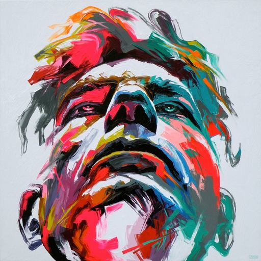 Nu schildert hij gezichten, dikwijls in close-up, met hevige kleuren in